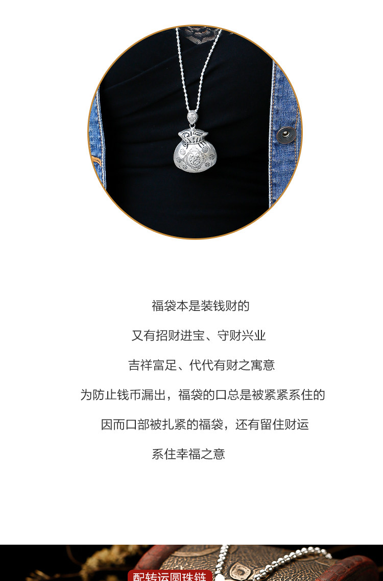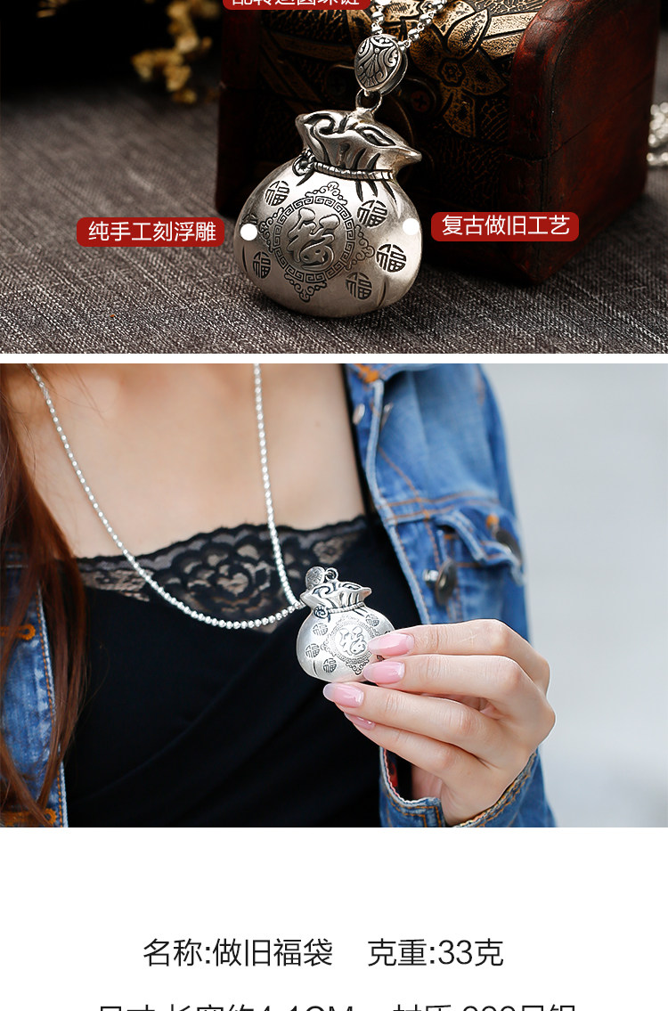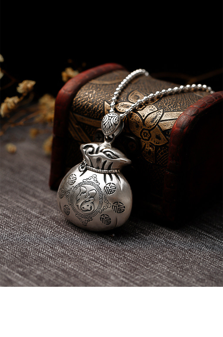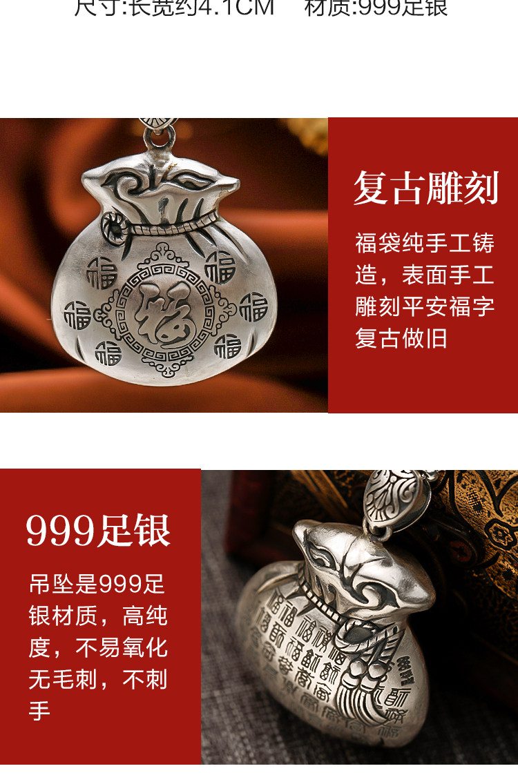 宝贝收到就带上了,是纯银的,福袋坠的大小合适,链子长短适中,非常喜欢,高兴之余忘记评价了,五星,五星,五星,店家服务态度非常好,我特偏爱银饰品,以后就选这家了,谢谢老板的纯银饰品,